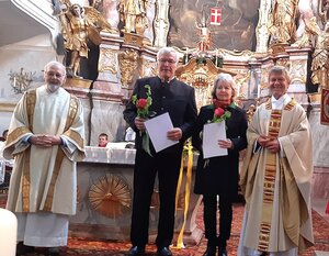 Bevor zum Auszug das „Großer Gott wir loben dich“ mit vierstimmigen Überchor erklang, gab es für beide Jubilare noch einen Blumengruß, überreicht von Pfarrgemeinderats-Vorsitzenden Manfred Hartl und Barbara Fraunhofer-Zell von der Kirchenverwaltung. Hernach traf man sich bei strahlendem Herbstwetter vor dem Pfarrzentrum, wo die Gratulanten mit frischen „Auszognen“, Kaffee und Getränken bewirtet wurden und es noch genügend Gelegenheit zu einem zwanglosen Ratsch gab. ls